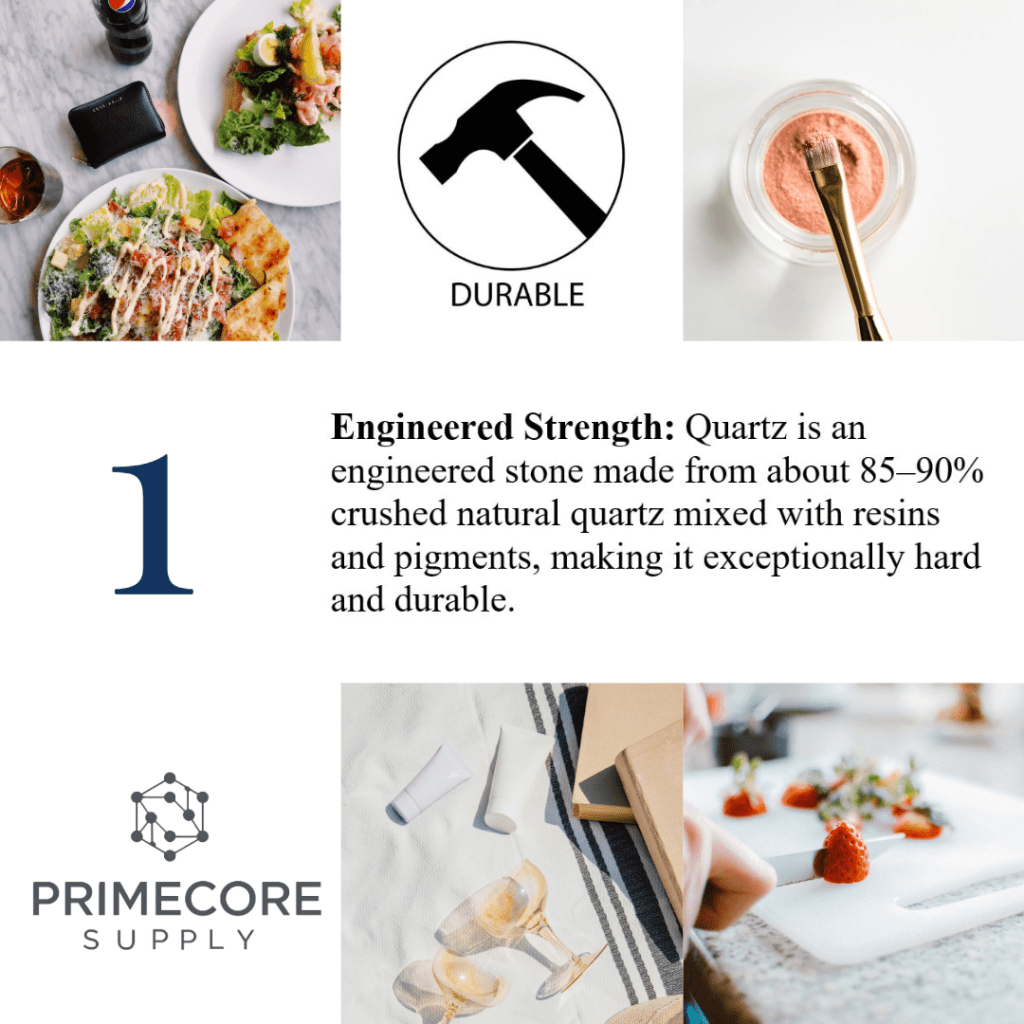 - Engineered Strength: Quartz is an engineered stone made from about 85–90% crushed natural quartz mixed with resins and pigments, making it exceptionally hard and durable.