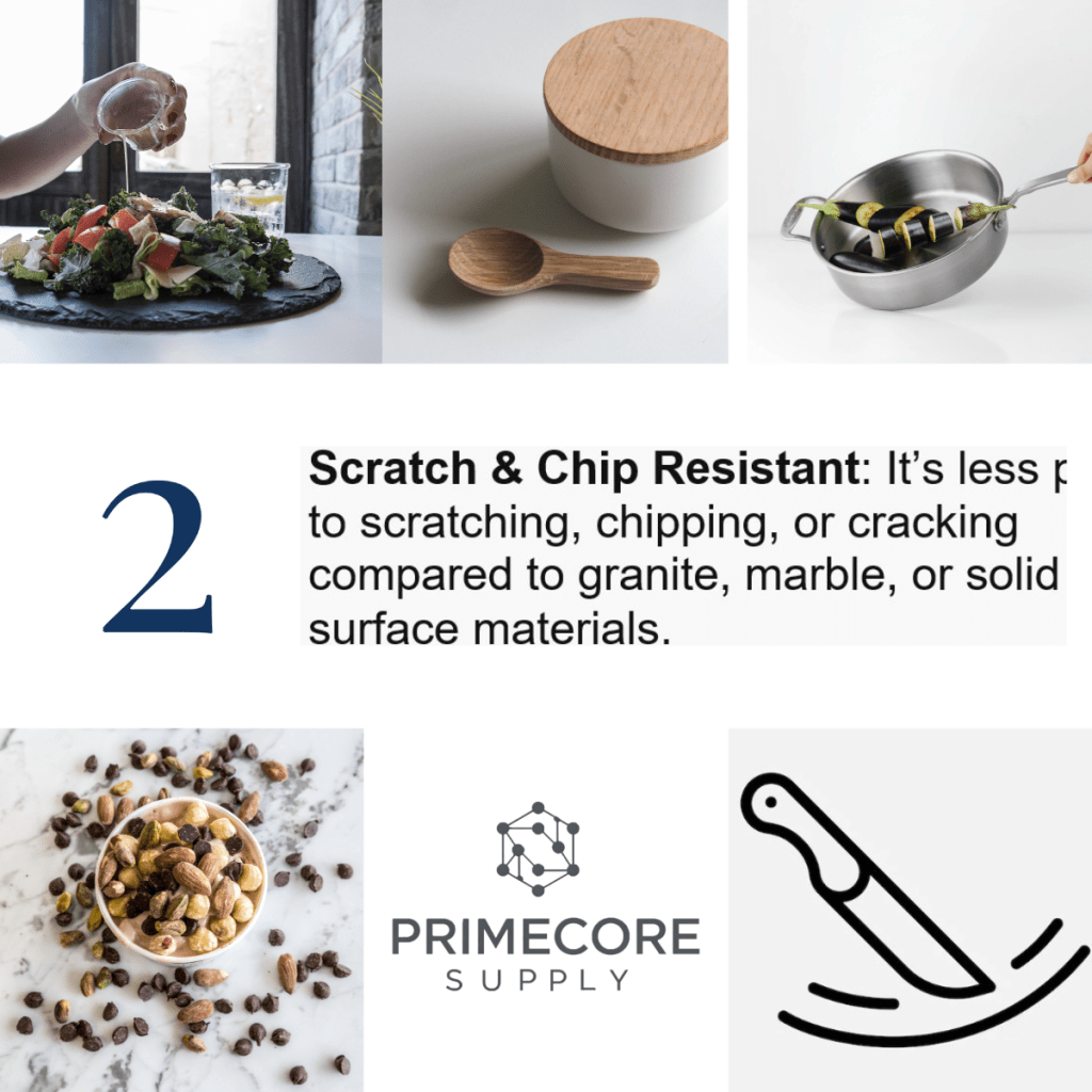 - Scratch & Chip Resistant: It’s less prone to scratching, chipping, or cracking compared to granite, marble, or solid surface materials.