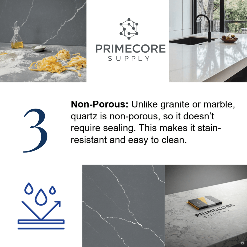 - Non-Porous: Unlike granite or marble, quartz is non-porous, so it doesn’t require sealing. This makes it stain-resistant and easy to clean.