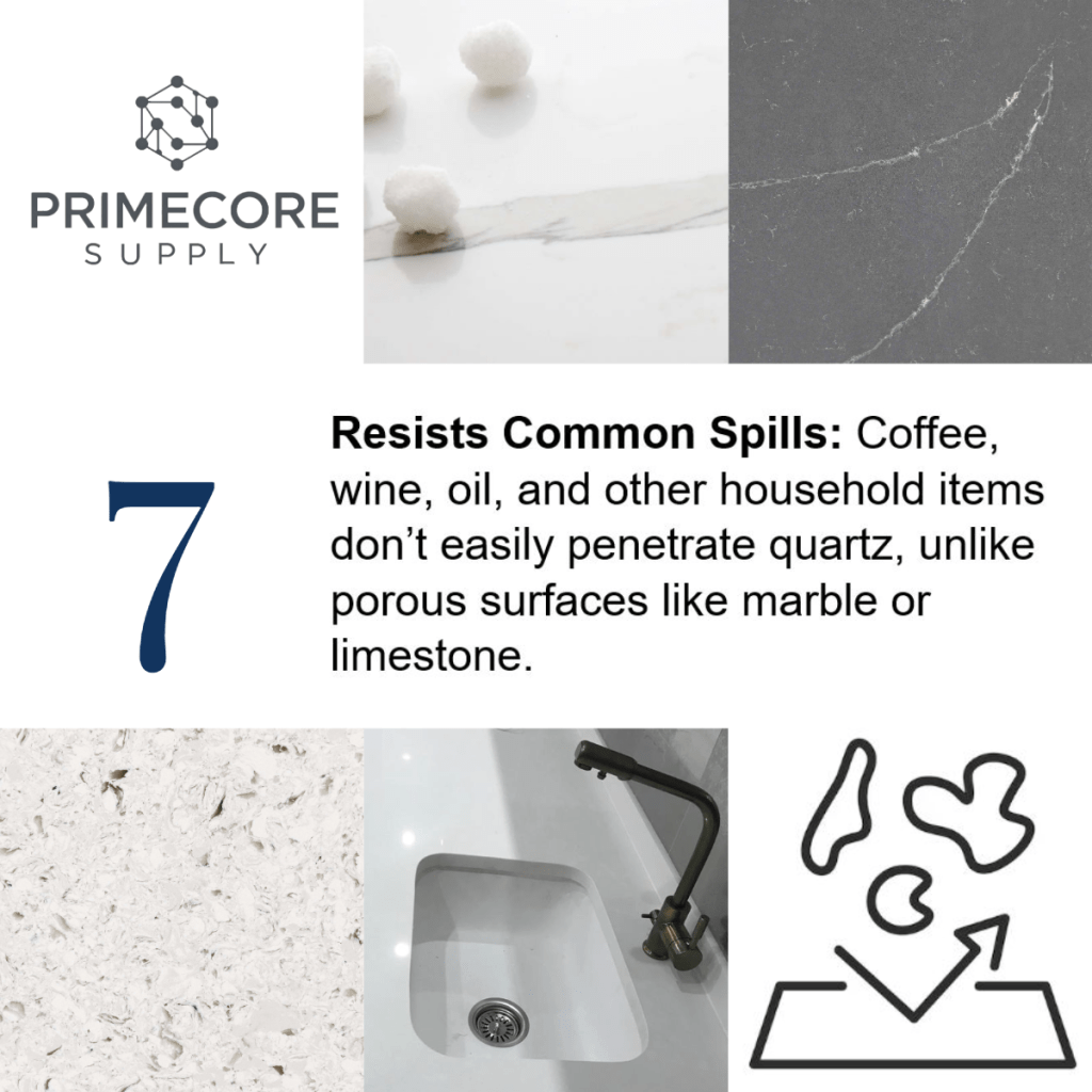 - Resists Common Spills: Coffee, wine, oil, and other household items don’t easily penetrate quartz, unlike porous surfaces like marble or limestone.